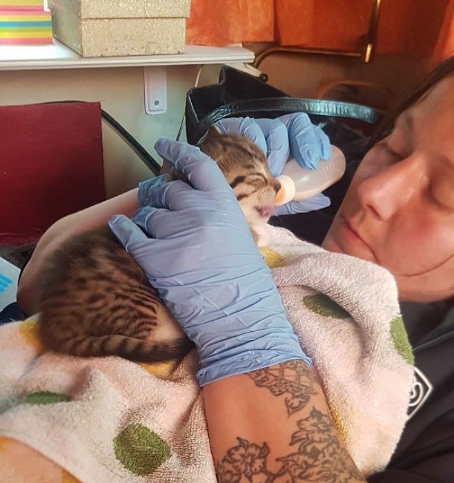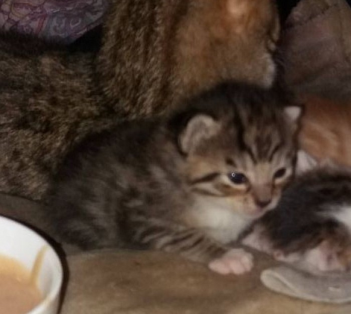 Mitten in der Nacht ist Tyga durch den Zugang zu uns reingekommen und hat uns laut verzweifelt maunzend geweckt weil scheinbar was passiert ist und sie unsere Hilfe braucht. Sie will uns zwischen den Wohnwagen was zeigen. Als Gregor dazwischen leuchtet ist das dunkel getigerte Baby zwischen Steinen und der Achse eingeschlossen. Scheinbar ist es vom Dach gefallen ist und sie wollte es zu uns reinbringen, wobei sie es erneut fallen ließ da der Zugang nicht breit genug für beide ist. Er zieht ihn raus und gibt ihn mir. Zum Glück ist ihm auf den ersten Blick nichts passiert aber er ist total ängstlich und verfroren am zittern. Tyga geht zurück auf das Dach und macht weiter radau. Darauf hin haben wir beschlossen die Kitten vom Dach zu uns reinzuholen und uns ganz um sie zu kümmern. Um 4 Uhr sind wir endlich mit allen drin und warten das Tyga mit reinkommt und sich um ihre Kitten kümmert, leider vergeblich. Also wurde kurz nach 9 Uhr das erste mal gewogen und die erste Flasche gefüttert.
