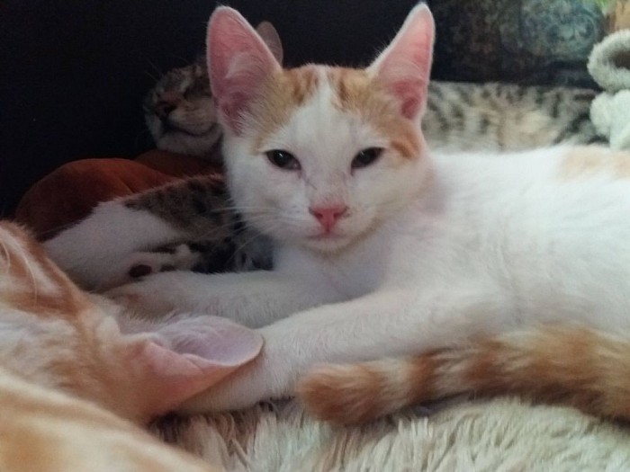 Filou ist ein richtig süßer, verschmuster Kater. Am Anfang mussten wir etwas Geduld haben aber das ist denke ich für jeden zu verstehen. Immerhin war er draußen mit Mama Whitey und seinen Geschwistern und Cousins samt Oma Onkel und Tante zusammen in Freiheit. Und dann will man nur die Leckerli holen und da schnappt die dumme Falle zu und man kommt in geschlossene Räume zu Cousins die man nur vom Fenster kennt und zwei komischen zweibeinern, die man zwar schon gesehen hat aber noch nie so nah.